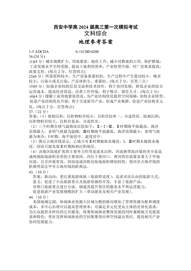 陕西省西安中学2024届高三模拟考试(一)文科综合答案