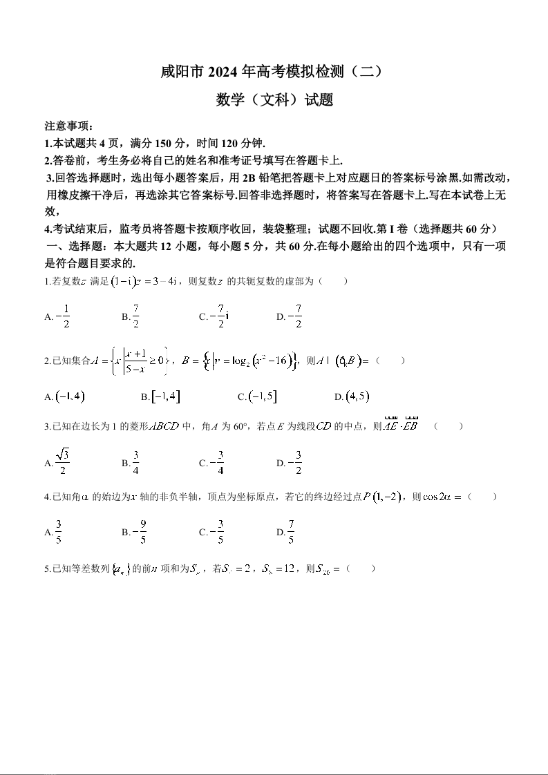 陕西省咸阳市2024届高三下学期高考模拟检测(二模)文科数学含答案