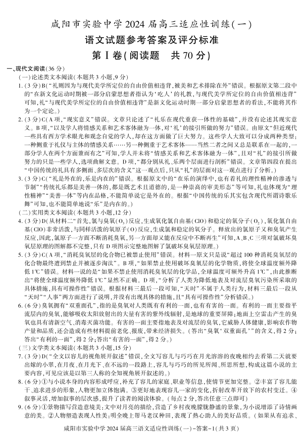 陕西省咸阳市实验中学2024届高三下学期适应训练(一)语文答案