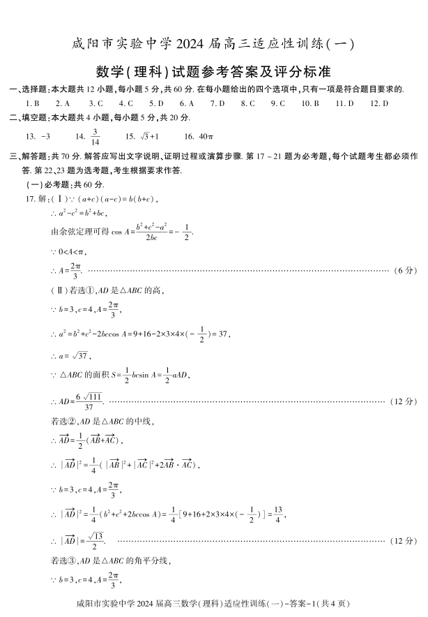 陕西省咸阳市实验中学2024届高三下学期适应训练(一)理科数学答案