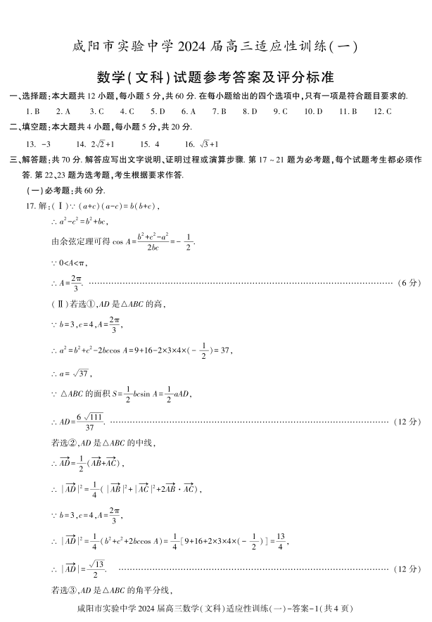 陕西省咸阳市实验中学2024届高三下学期适应训练(一)文科数学答案