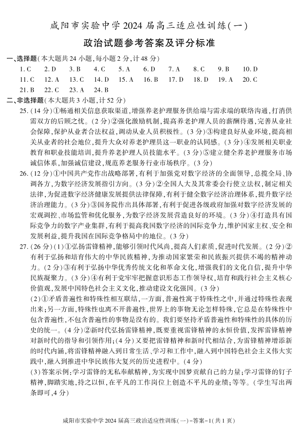陕西省咸阳市实验中学2024届高三下学期适应训练(一)政治答案