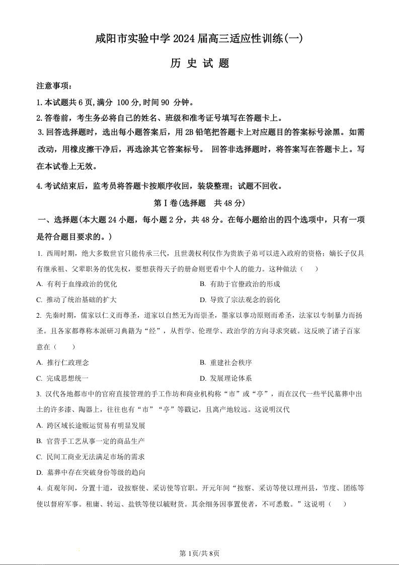 陕西省咸阳市实验中学2024届高三下学期适应训练(一)历史(原卷版)