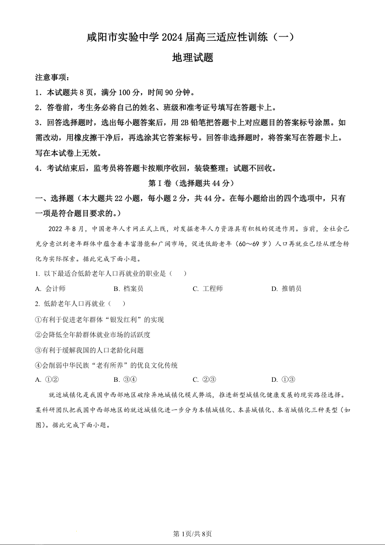 陕西省咸阳市实验中学2024届高三下学期适应训练(一)地理(原卷版)