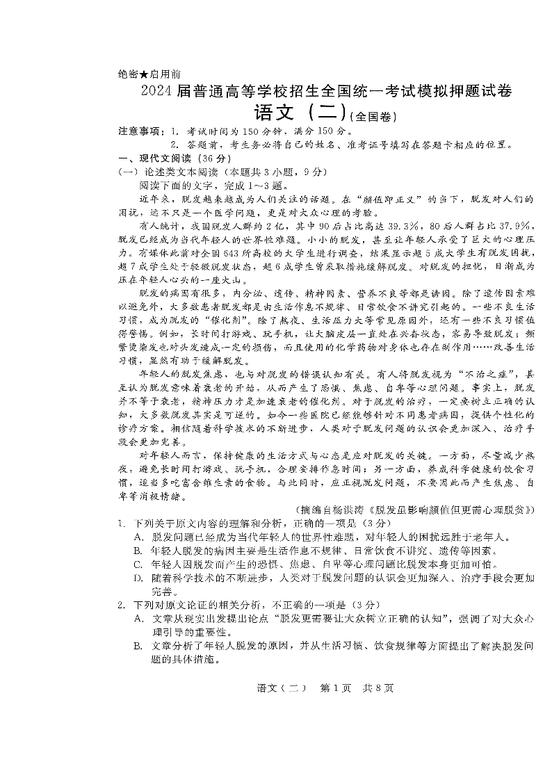 陕西省西安一中2024届普通高等学校招生全国统一考试模拟押题(二)(全国卷)语文