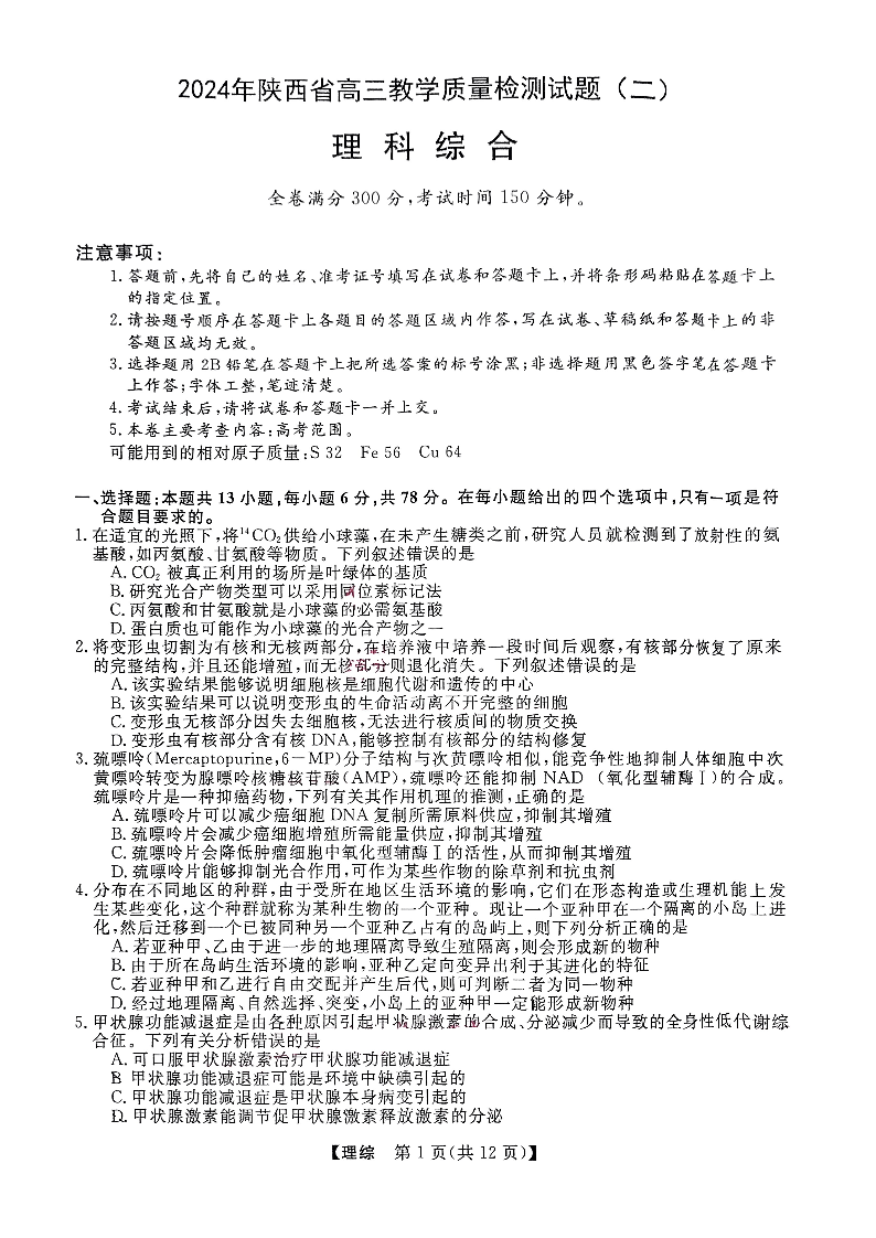 陕西省2024届高三下学期教学质量检测(二)理科综合
