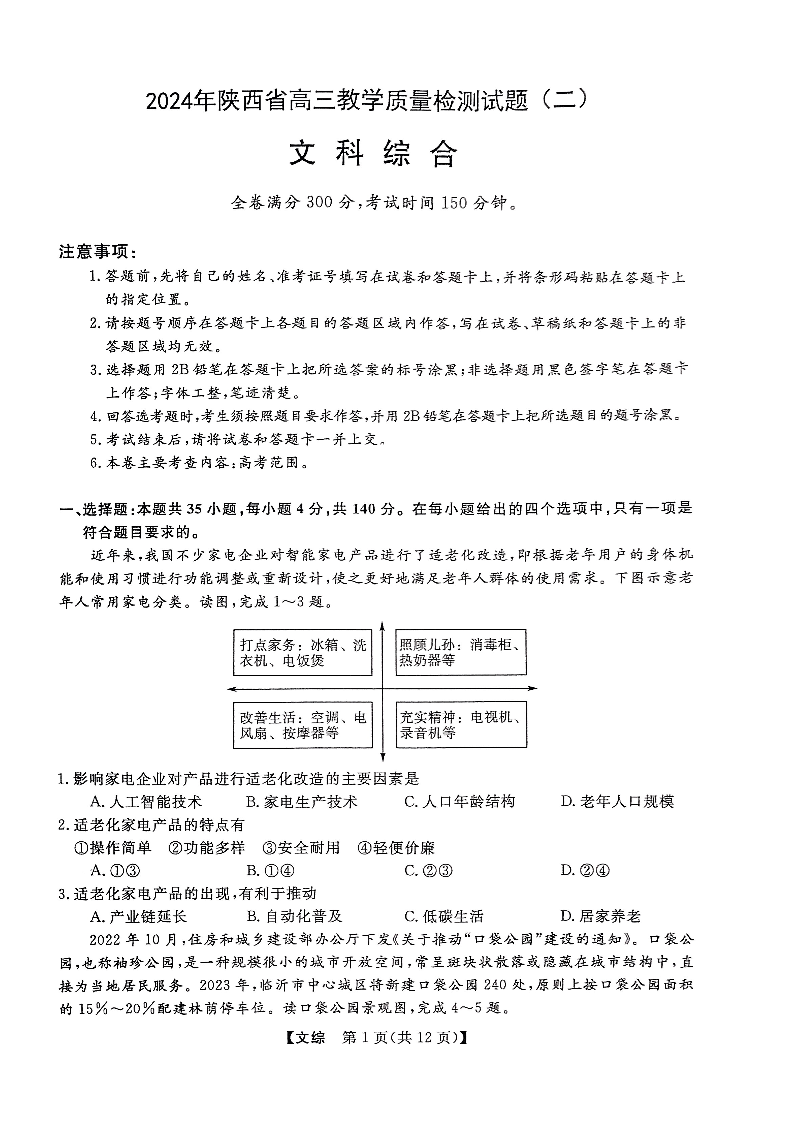陕西省2024届高三下学期教学质量检测(二)文科综合