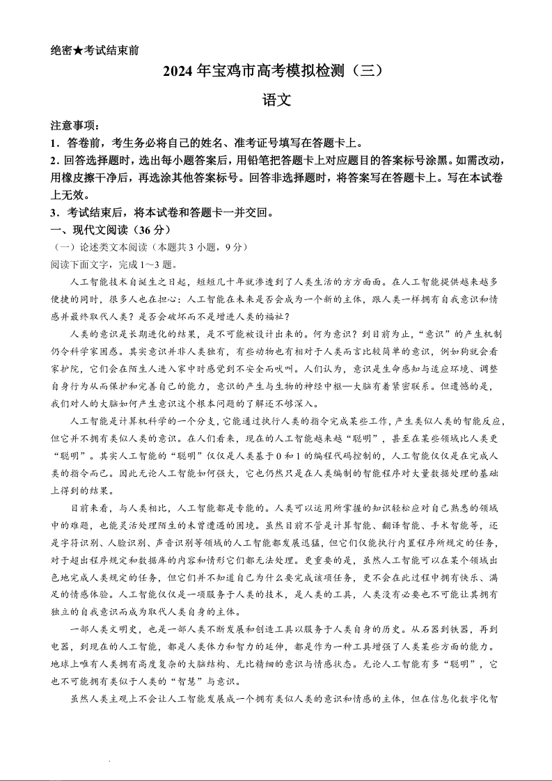 陕西省宝鸡市2024届高三下学期高考模拟检测(三)语文含答案
