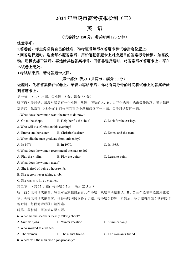 陕西省宝鸡市2024届高三下学期高考模拟检测(三)英语含答案