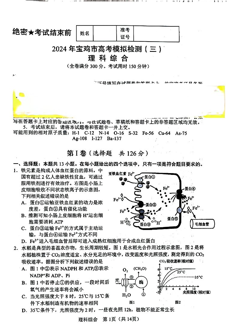 陕西省宝鸡市2024届高三下学期高考模拟检测(三)理科综合