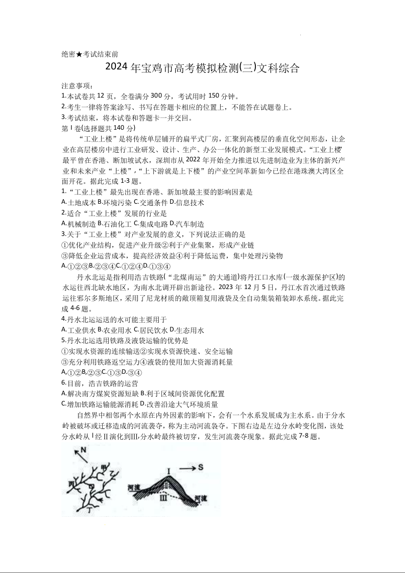 陕西省宝鸡市2024届高三下学期高考模拟检测(三)文科综合含答案