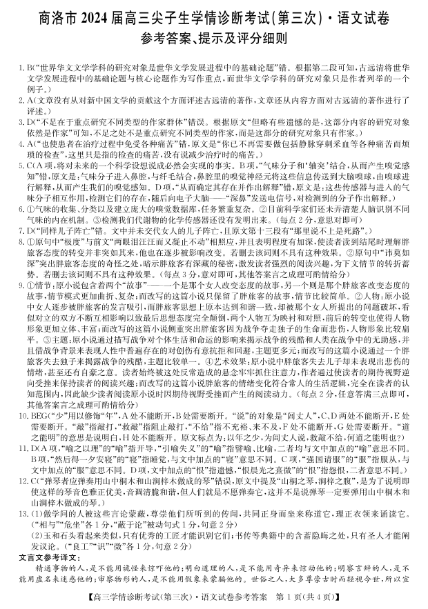 陕西省商洛市2024届高三下学期尖子生学情诊断考试(第三次)语文答案