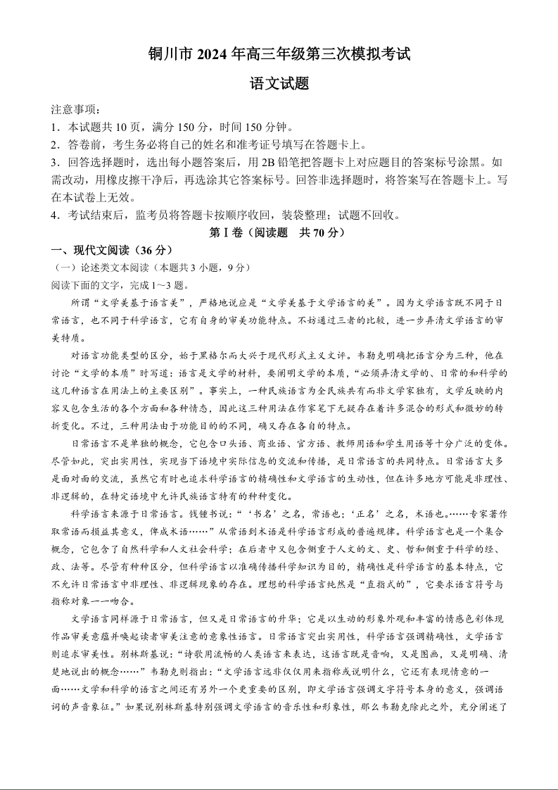 陕西省铜川市2024届高三下学期第三次模拟考试语文含答案
