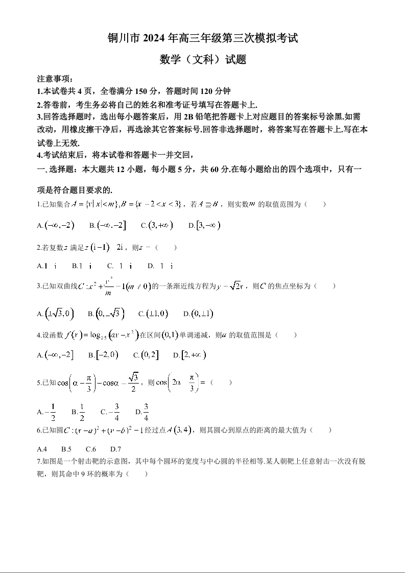 陕西省铜川市2024届高三下学期第三次模拟考试文科数学含答案