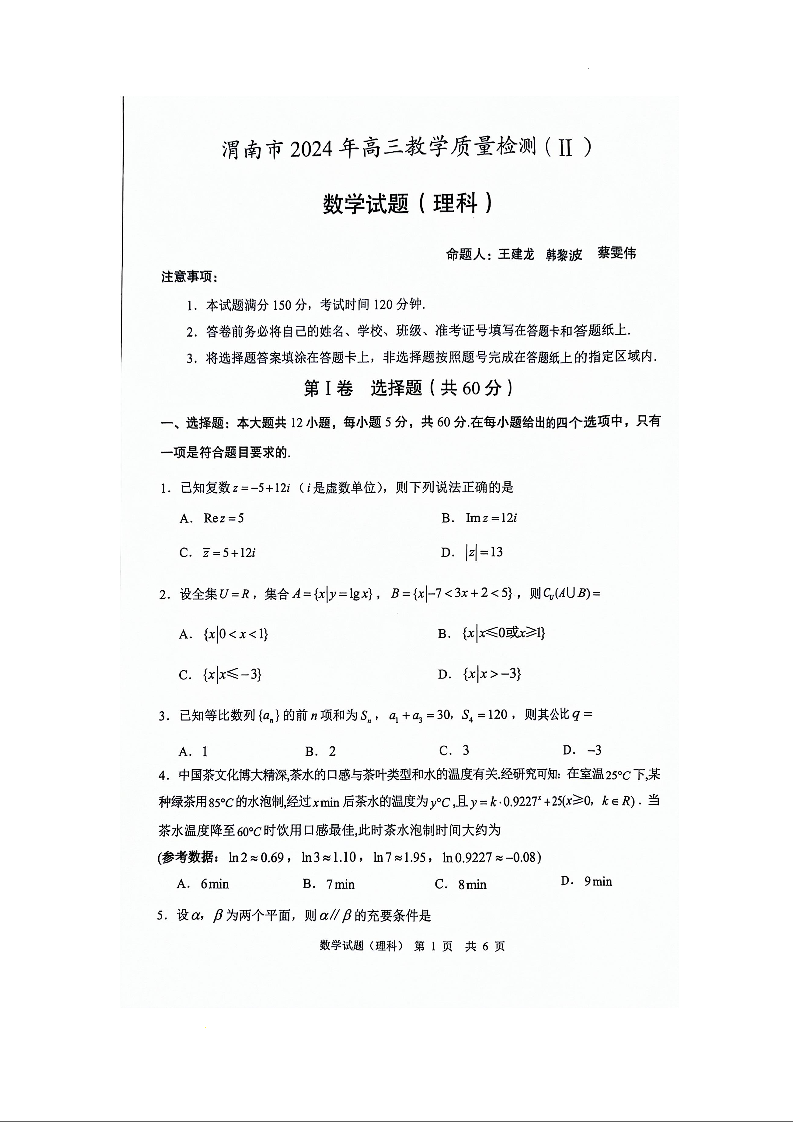 陕西省渭南市2024届高三下学期教学质量检测(二模)理科数学