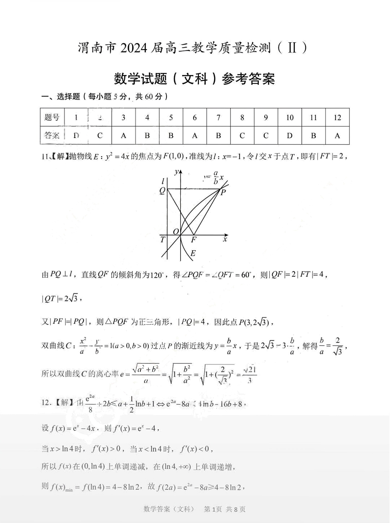 陕西省渭南市2024届高三下学期教学质量检测(二模)文科数学答案