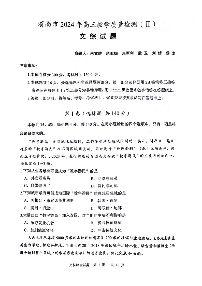 陕西省渭南市2024届高三下学期教学质量检测(二模)文科综合