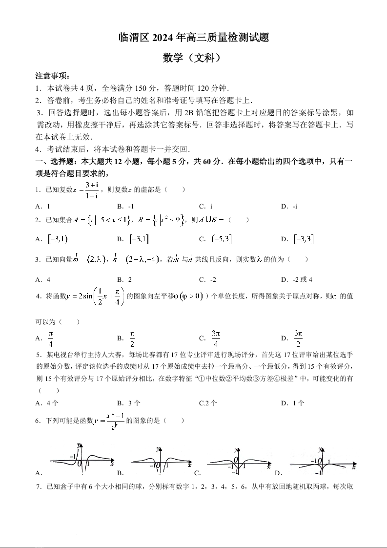陕西省渭南市临渭区2024届高三下学期三模文科数学含答案