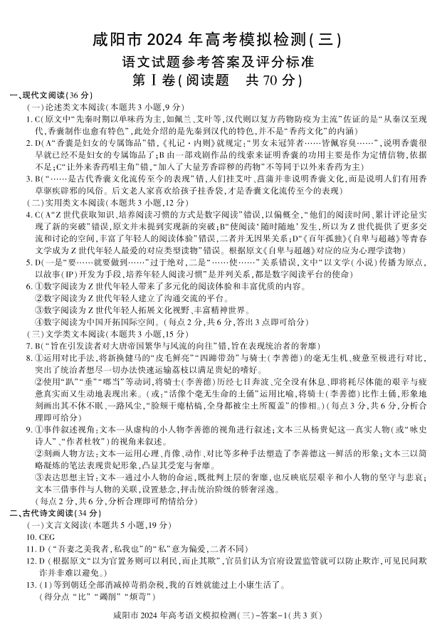 陕西省咸阳市2024届高三高考模拟检测(三)语文答案