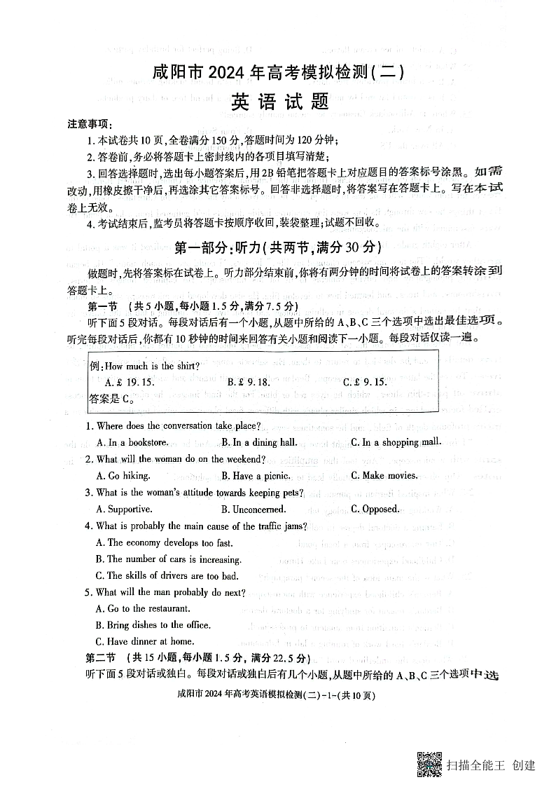 陕西省咸阳市2024届高三高考模拟检测(三)英语
