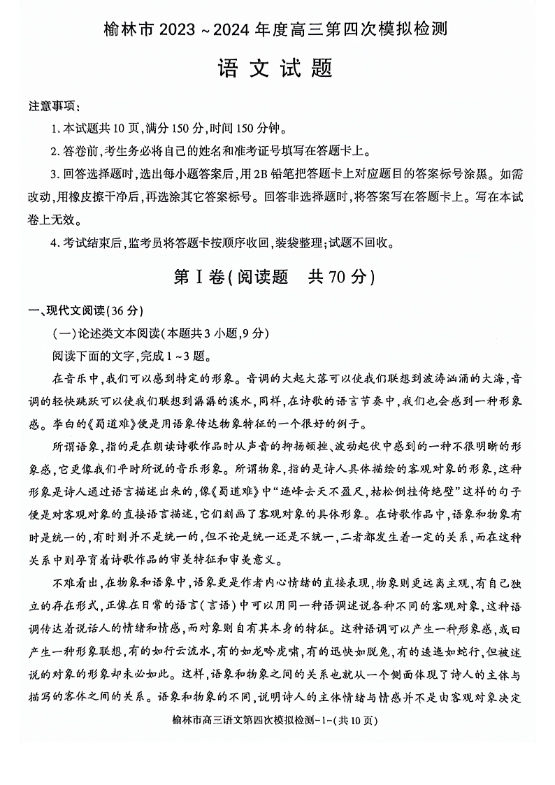 陕西省榆林市2024届高三下学期第四次模拟考试语文含答案