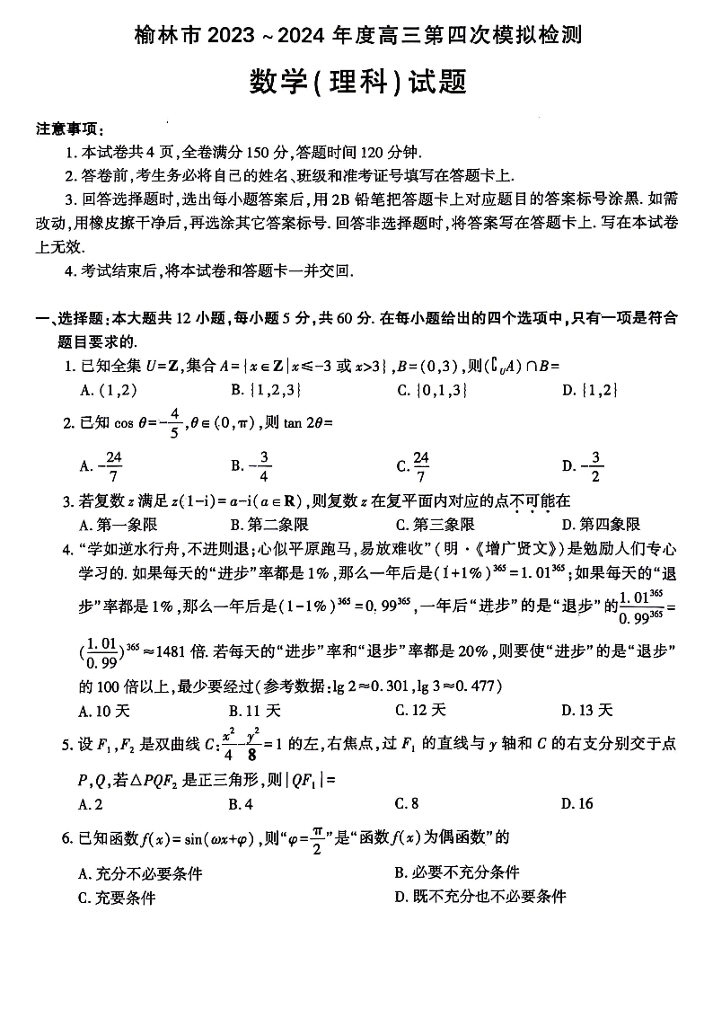 陕西省榆林市2024届高三下学期第四次模拟考试理科数学含答案