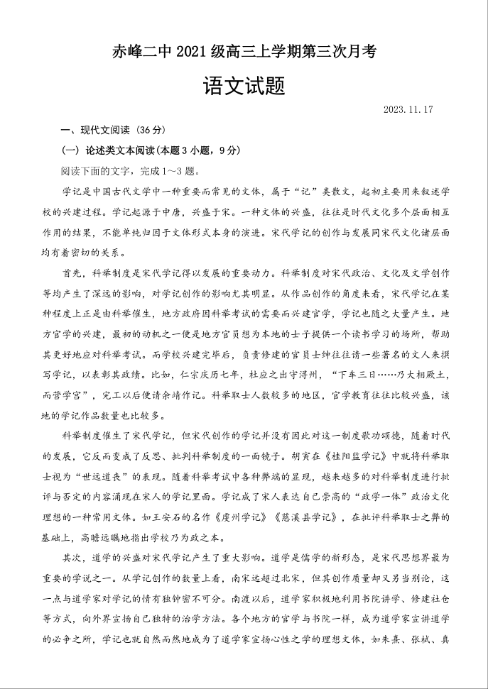 内蒙古赤峰二中2023-2024学年高三上学期第三次月考 语文