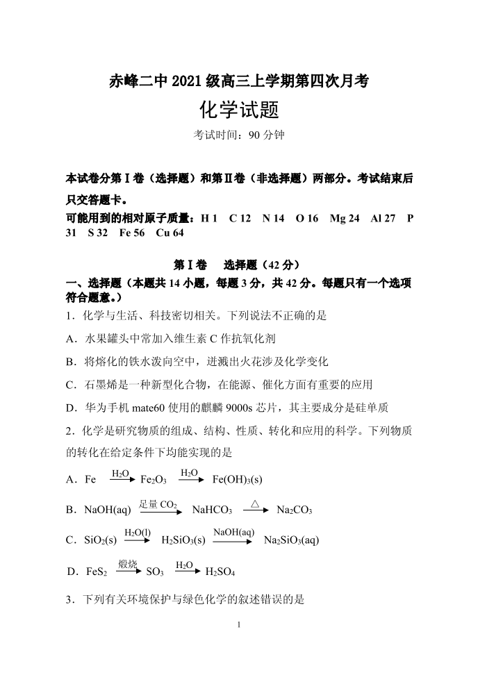 内蒙古赤峰二中2023-2024学年高三上学期第四次月考化学试题