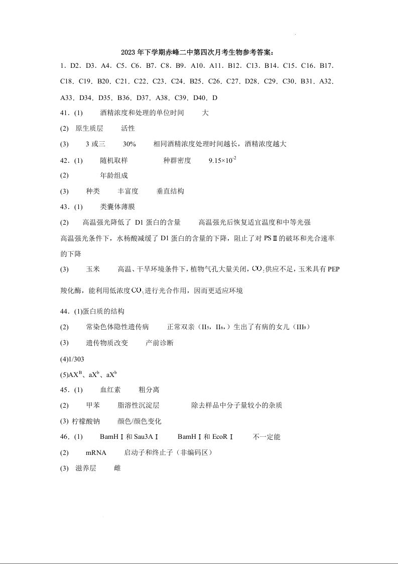 内蒙古赤峰二中2023-2024学年高三上学期第四次月考生物答案