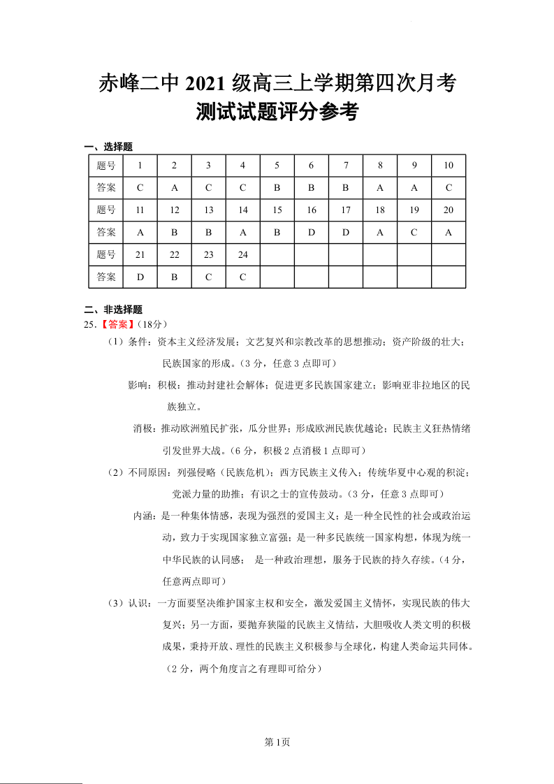 内蒙古赤峰二中2023-2024学年高三上学期第四次月考历史答案