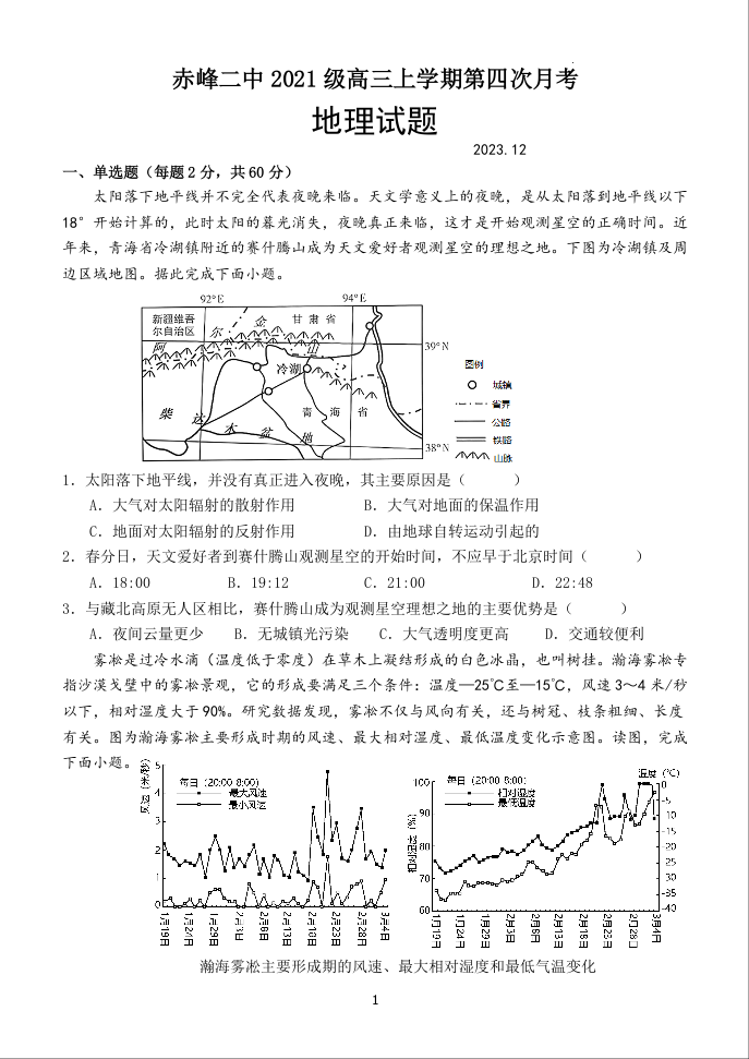 内蒙古赤峰二中2023-2024学年高三上学期第四次月考地理试题