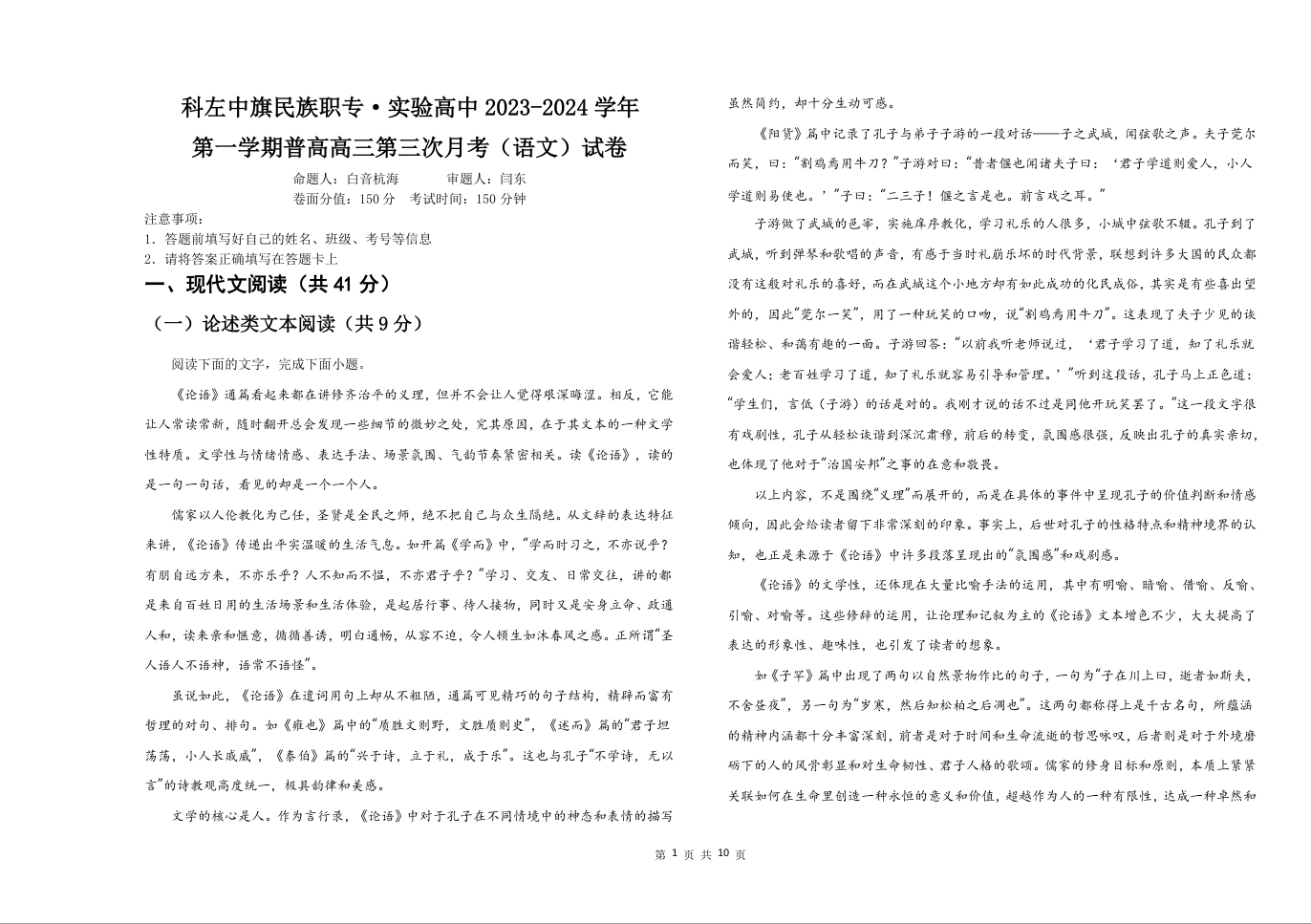 内蒙古科左中旗实验高中2024届高三上学期12月月考语文+答案