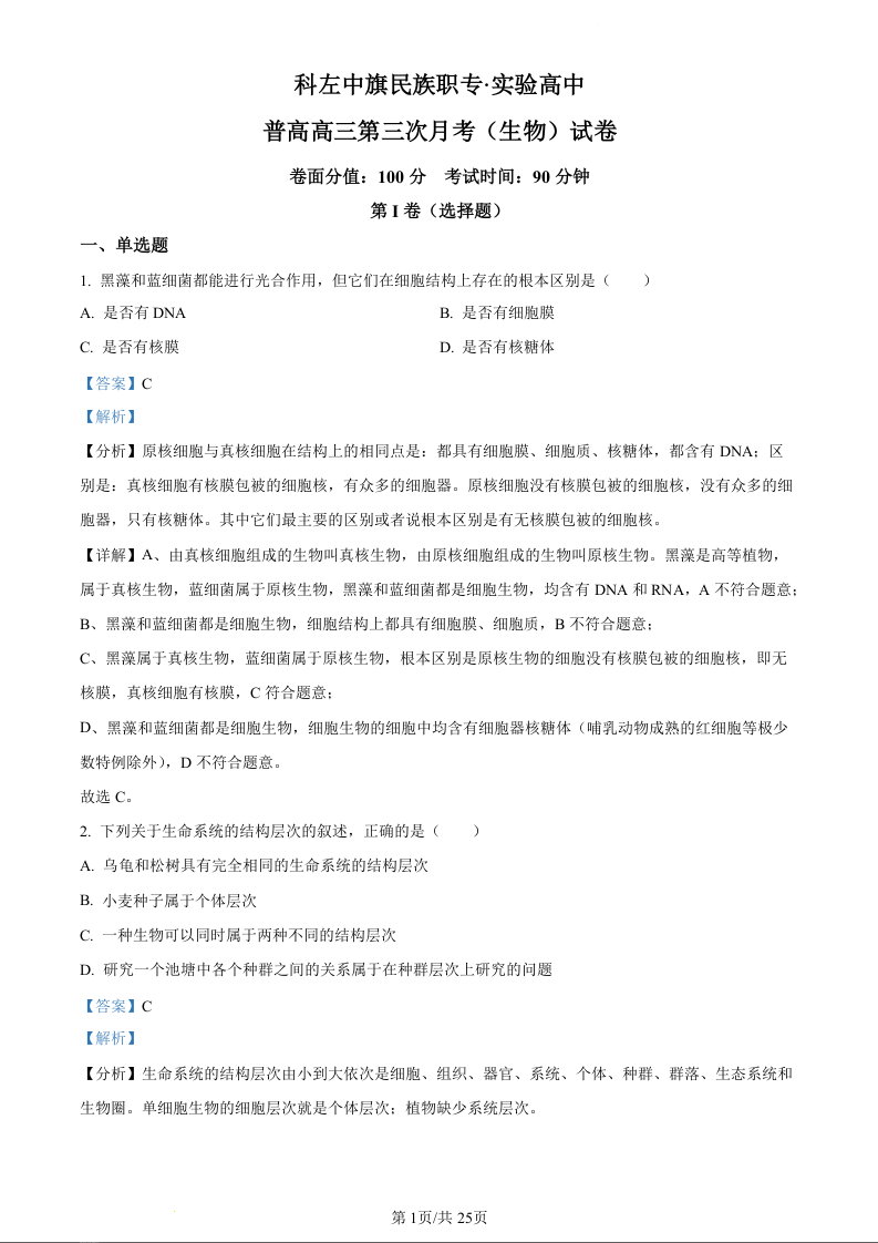 内蒙古科左中旗实验高中2024届高三上学期12月月考生物试题(精品解析版)
