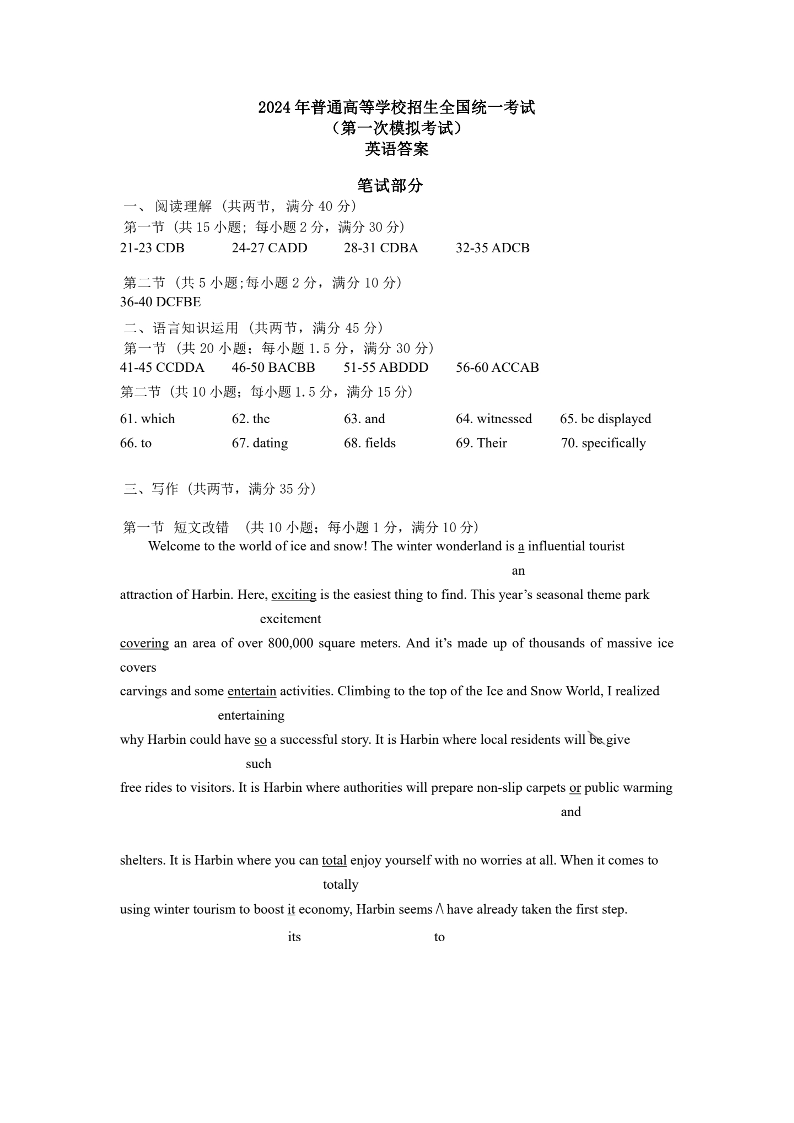2024届内蒙古自治区包头市高三下学期一模英语答案