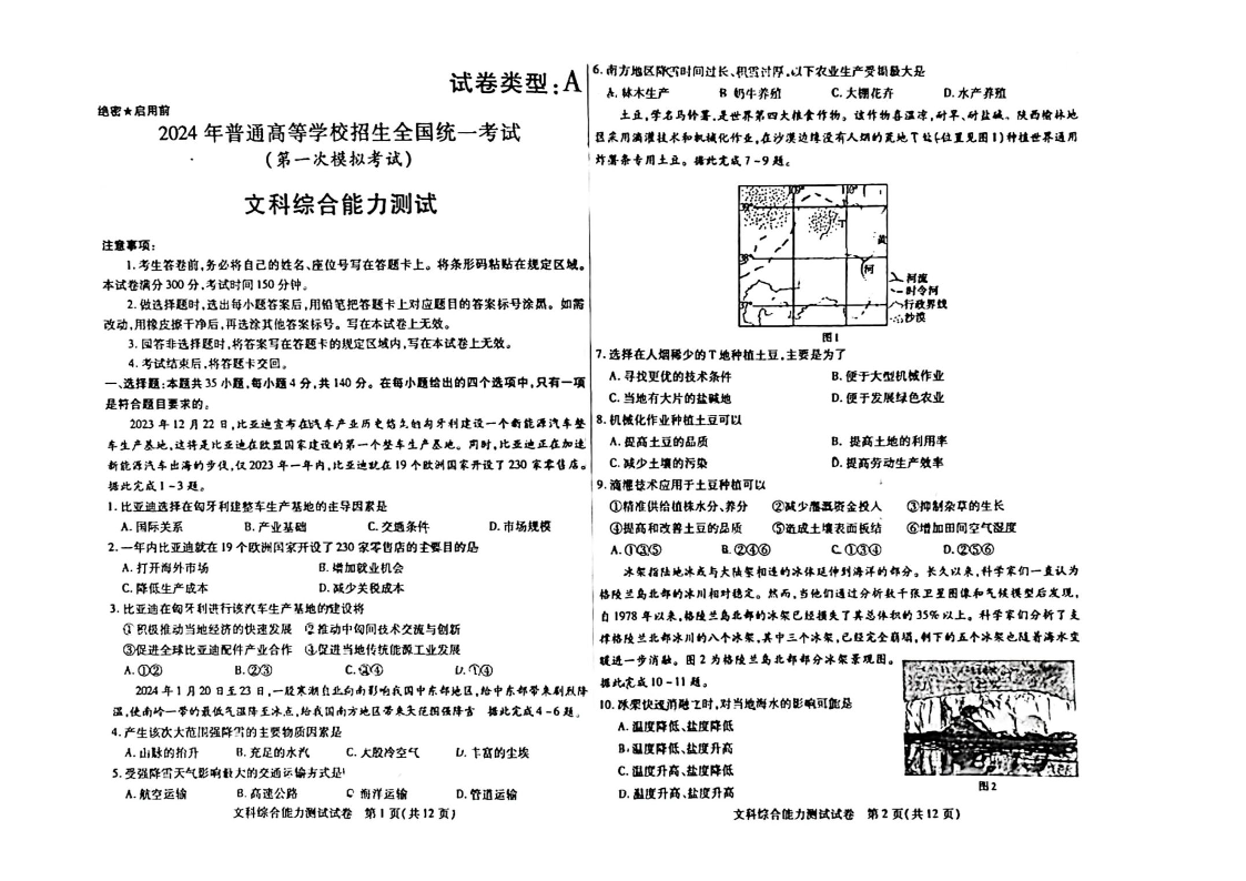 2024届内蒙古自治区包头市高三下学期一模文科综合