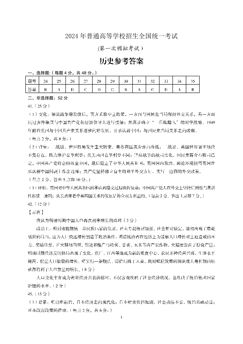 2024届内蒙古自治区包头市高三下学期一模历史答案