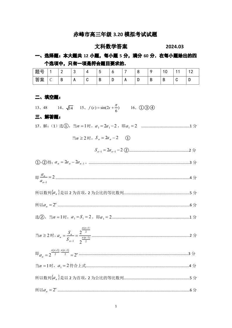 内蒙古赤峰市2024届高三下学期3·20模拟考试文科数学答案
