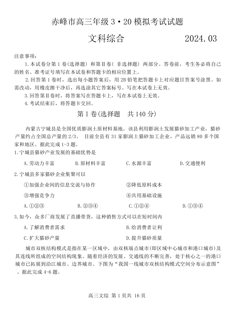 内蒙古赤峰市2024届高三下学期3·20模拟考试文科综合