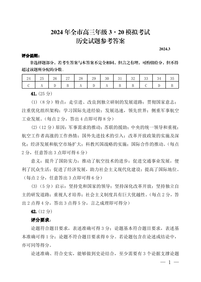 内蒙古赤峰市2024届高三下学期3·20模拟考试历史答案