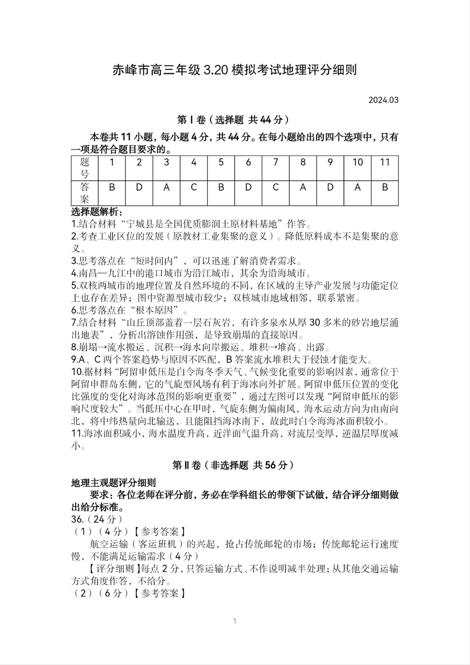 内蒙古赤峰市2024届高三下学期3·20模拟考试地理答案