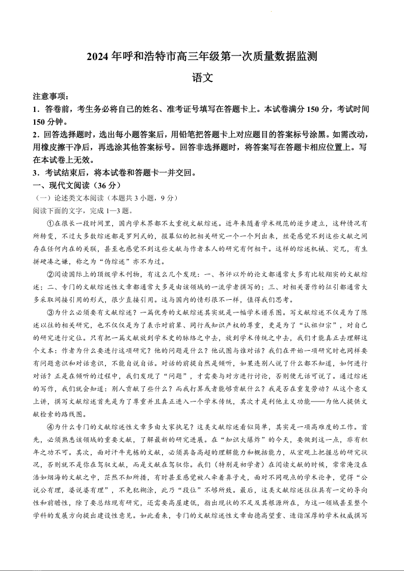 内蒙古呼和浩特市2024届高三第一次质量数据监测语文+答案