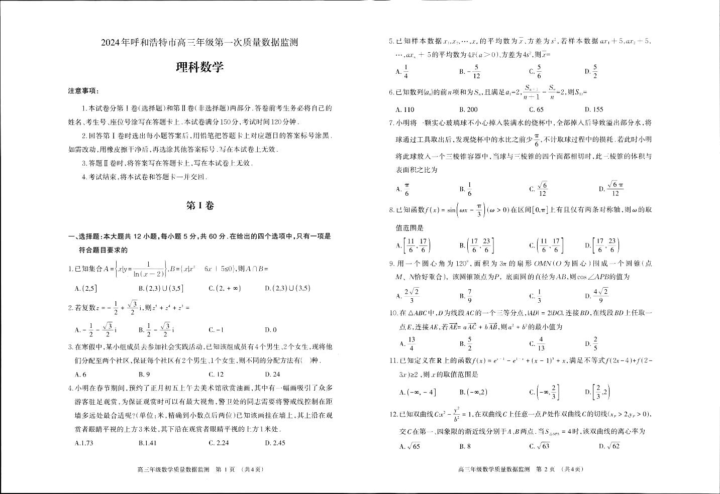 内蒙古呼和浩特市2024届高三第一次质量数据监测理科数学+答案
