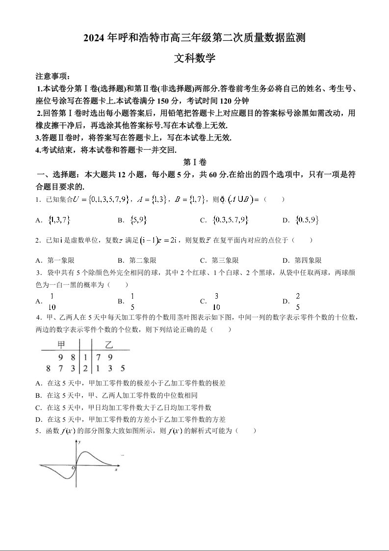 内蒙古呼和浩特市2024届高三年级第二次模拟检测文科数学+答案