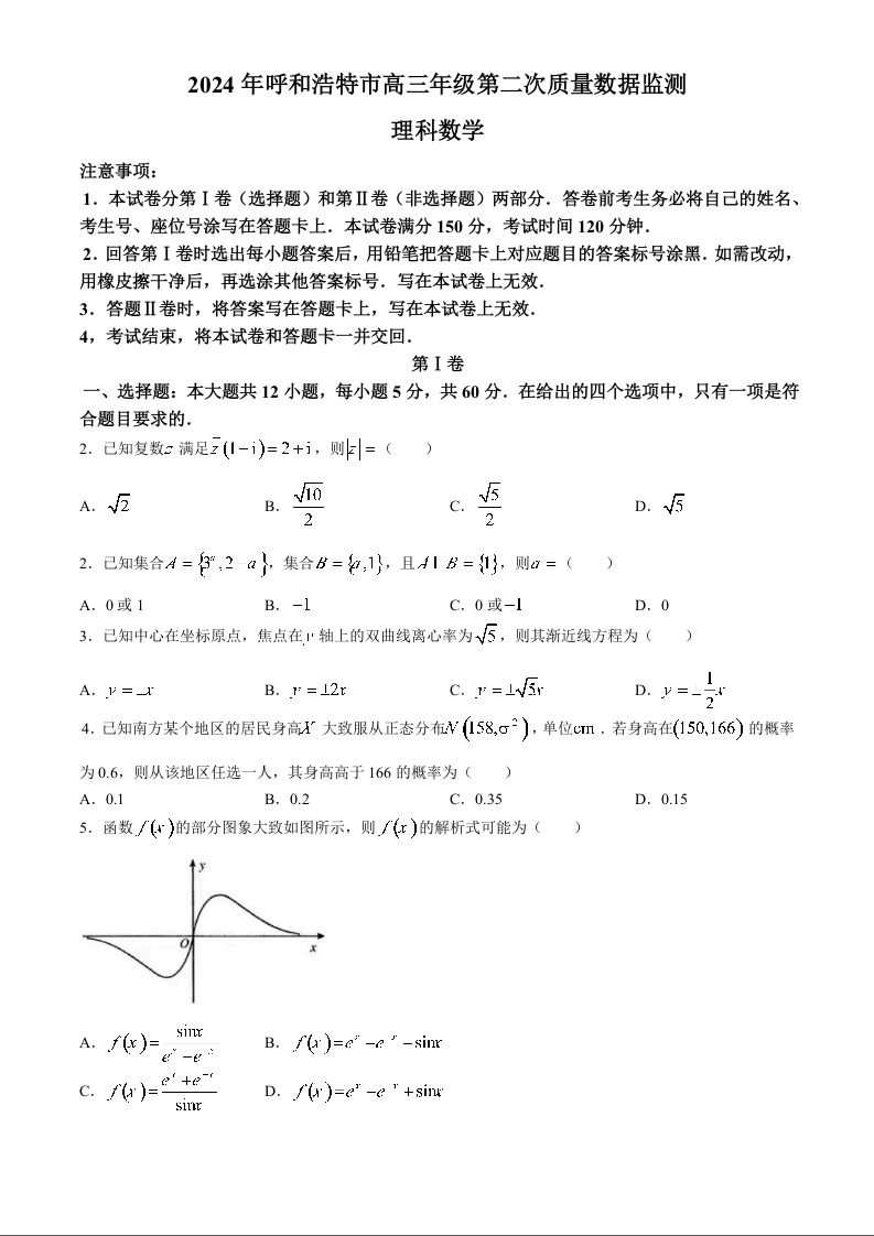 内蒙古呼和浩特市2024届高三年级第二次模拟检测理科数学+答案