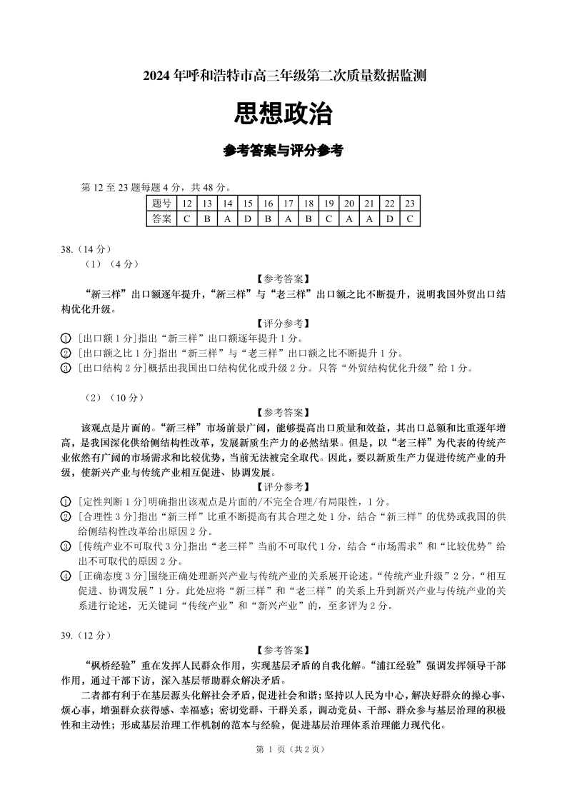 内蒙古呼和浩特市2024届高三年级第二次模拟检测文科综合答案