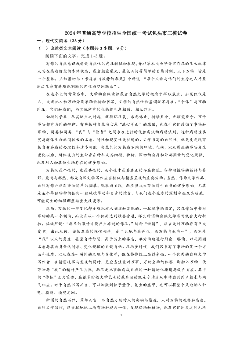 内蒙古自治区包头市2024届高三下学期三模语文