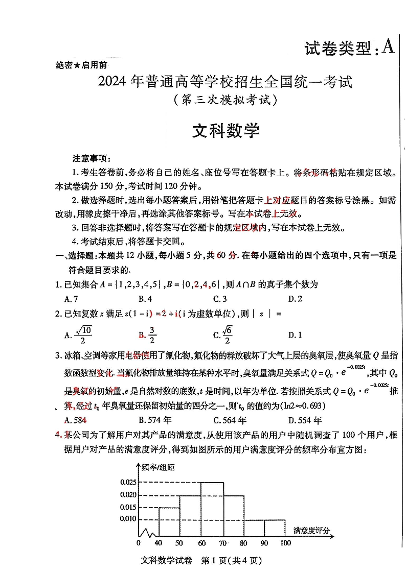 内蒙古自治区包头市2024届高三下学期三模文科数学+答案