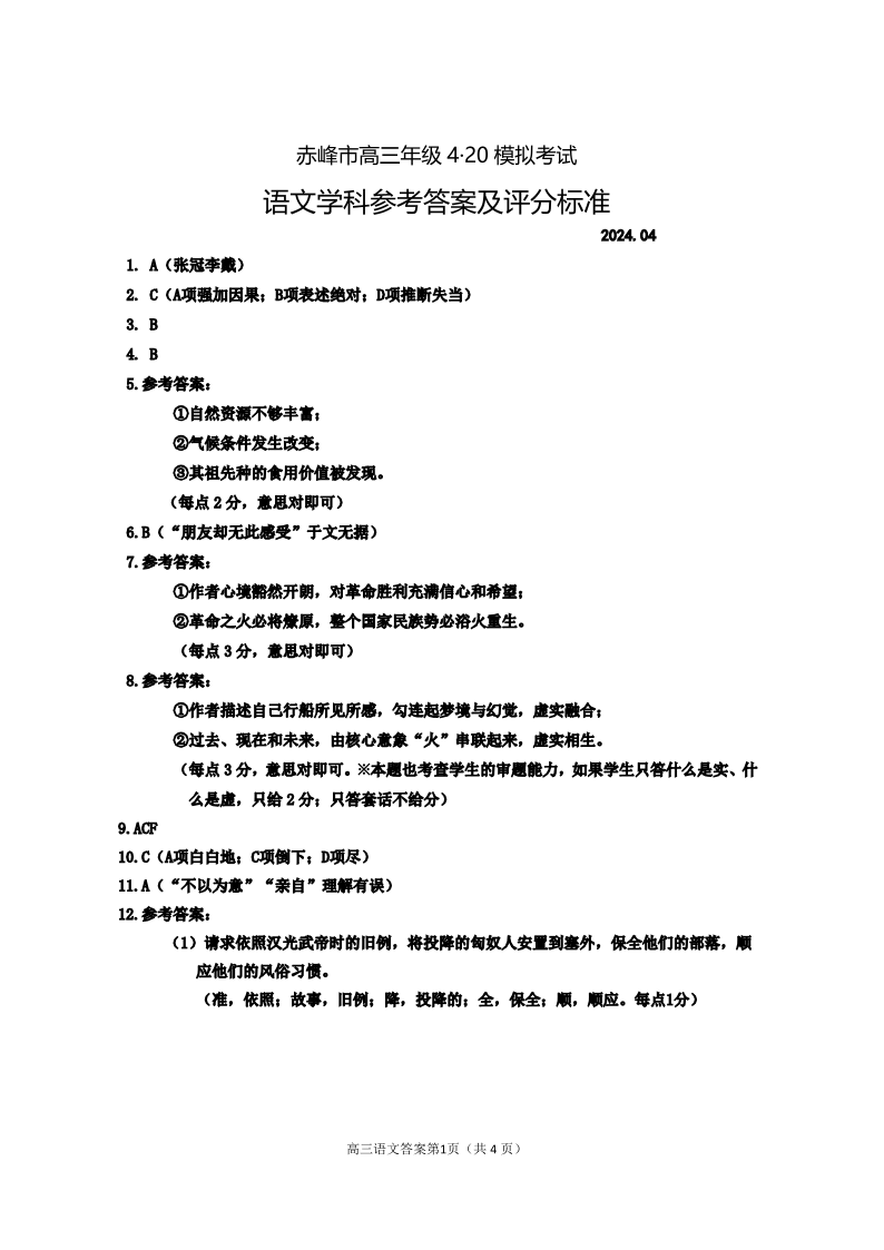 内蒙古自治区赤峰市2024届高三下学期420模拟考试语文答案