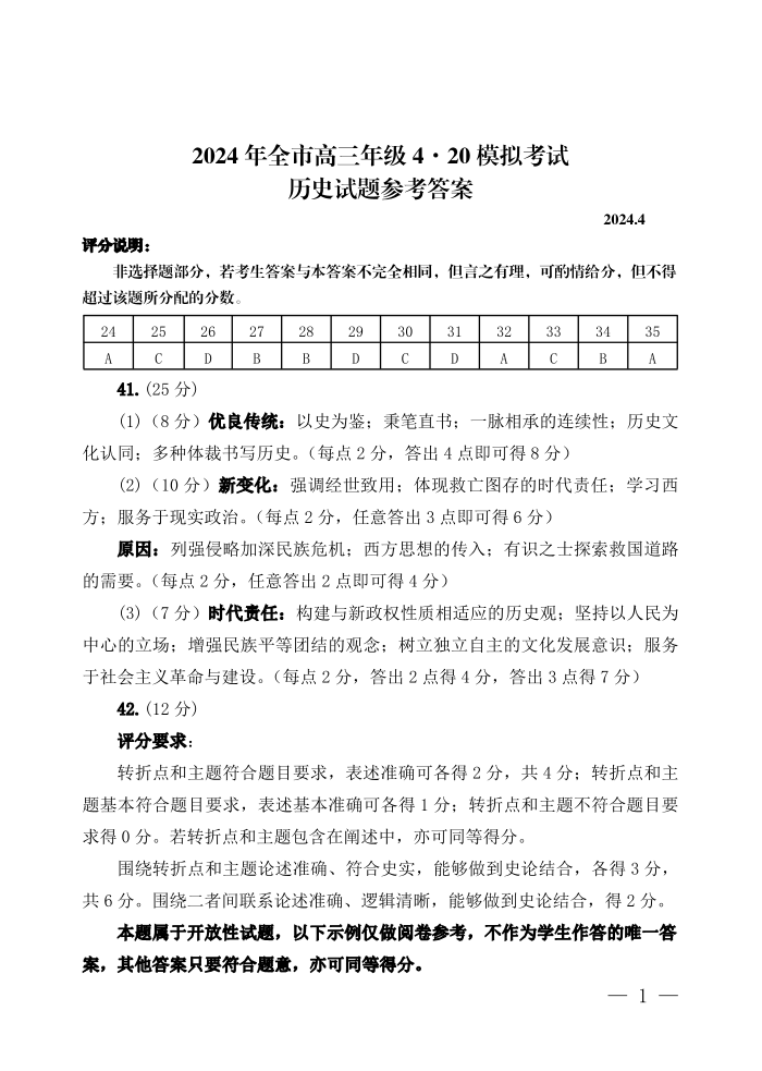 内蒙古自治区赤峰市2024届高三下学期420模拟考试历史答案