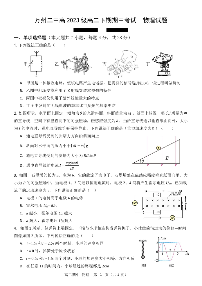 重庆市万州二中2024-2025学年下学期高二期中考试物理